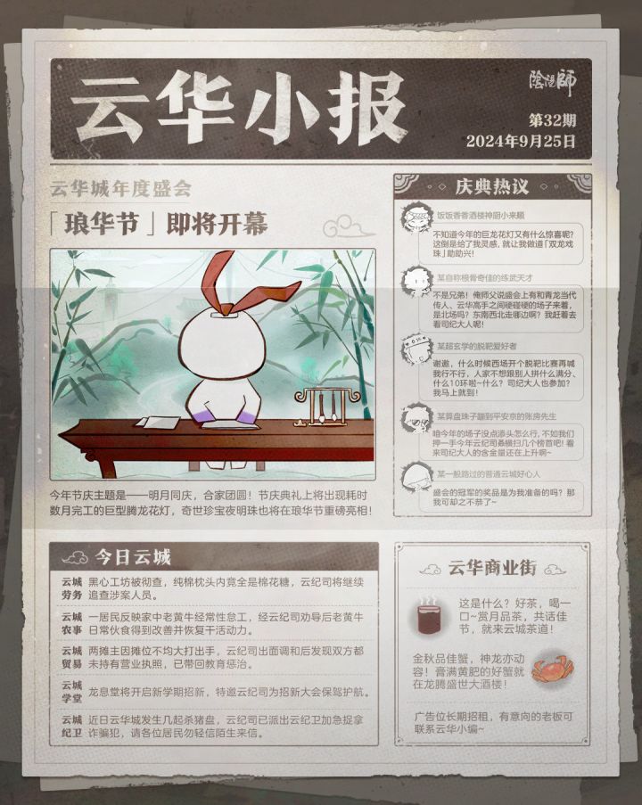 >>>参与方式<<<分享「云华见闻」活动截图>>>活动时间<<<10月1日-10月7日>>>活动奖励<<< 阴阳师插画套装(随机)*3>>>活动内容<<<灯明火彩,雪清梅瘦,在一派喜庆氛围中,云华城一年一度的琅华盛典即将开启!举城同庆的盛事容不得半点差池,想来云纪司会妥善处理的。瞧,是封阳君大人仗剑而行,在排查隐患,确保无虞。看来阴阳师大人无需过多操心了,只管感受云华城的风土