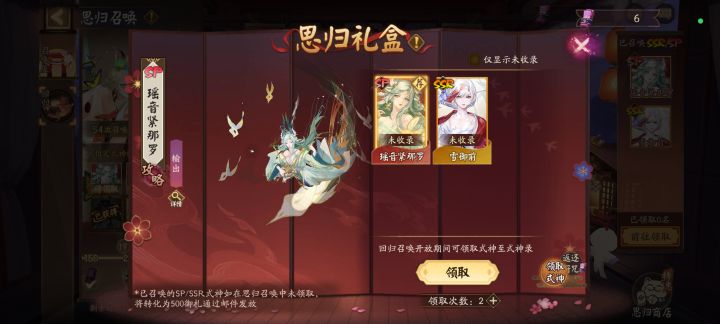 太久没玩回来一看以前的式神全成下水道了。。。思归召唤抽了一个sp紧那罗,一个雪御前,那自选ssr选什么呢?以及这个思归召唤要不要继续花勾玉抽啊,不知道和新版本抽卡活动比是不是要划算一点?