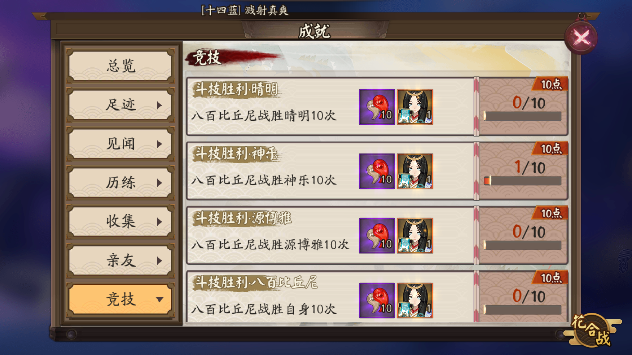 第一个问题:这个只有斗技和斗技练习可以完成这个成就,但是斗技没有人会使八百比丘尼或者源博雅呀!八百比丘尼你玩100把斗技没准能遇见一个。源博雅我是真没见过斗技有人用。反正我玩了这么长时间,我是真没见过。和朋友一起排练习半天排不到,排到了也是别人。强迫症表示很无奈啊!没法满技能,4人差一个没满技能。建议改一下,改成切磋胜利w。第二个问题:以前的插画能不能返场一下?老区没怎么玩了,玩的新区想要的