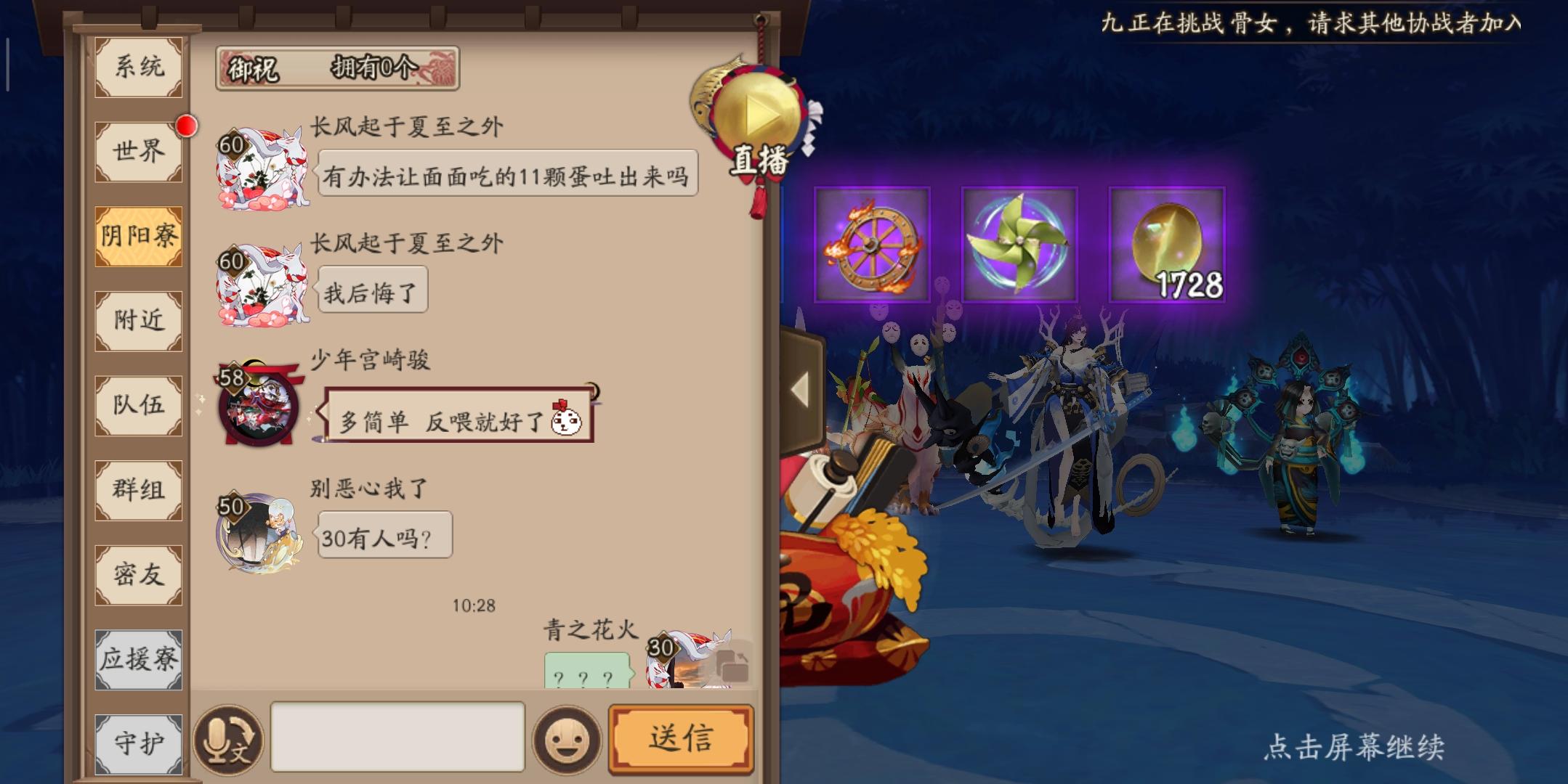一个问题,就是一个账号注册了两个区的角色,然后切换的时候寮聊天频道会串,聊天记录会保存,如图那个长风起于夏至之外是我百鬼夜行的号,这个寮频道也是百鬼夜行的寮,但是当我切换到另一个区时,如图寮频道的聊天记录不会删掉,还是百鬼夜行的寮频道,那个青之花火是鬼王之宴的号。反馈至此。