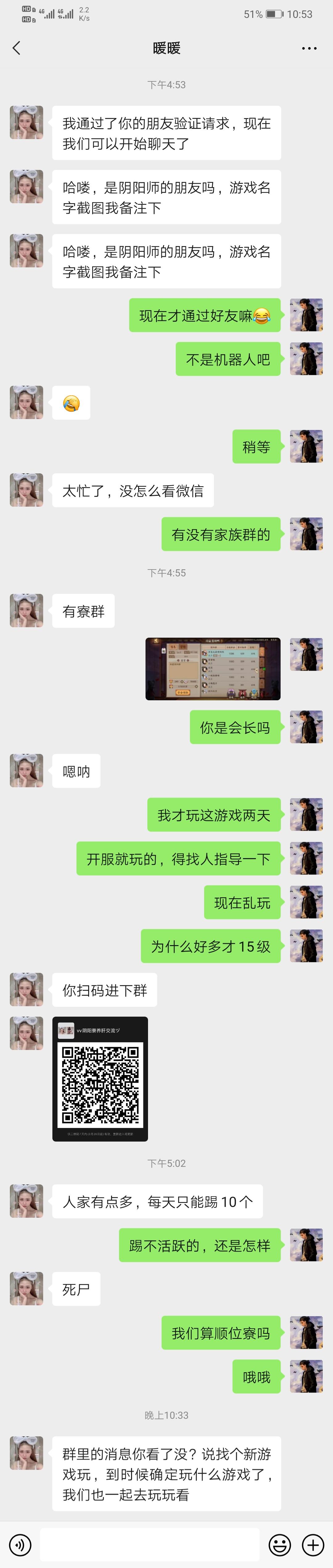 新区一开就加入这个阴阳寮,说完加微信,拉群,结果过了一天才同意好友,会长也才15级,然后就不玩了的样子,这一聊天,千呼万唤试出来呀!!