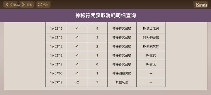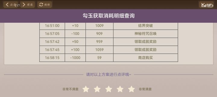 如题,勾玉消耗明细16:58:15这一栏(1000勾玉购买的蓝票)是有扣除记录的,为什么蓝票消耗明细没有对应记录。。。甚至过两分钟增加的蓝票都有记录了(想申诉也没地方申诉,所有申诉渠道都是机器人回复。。。