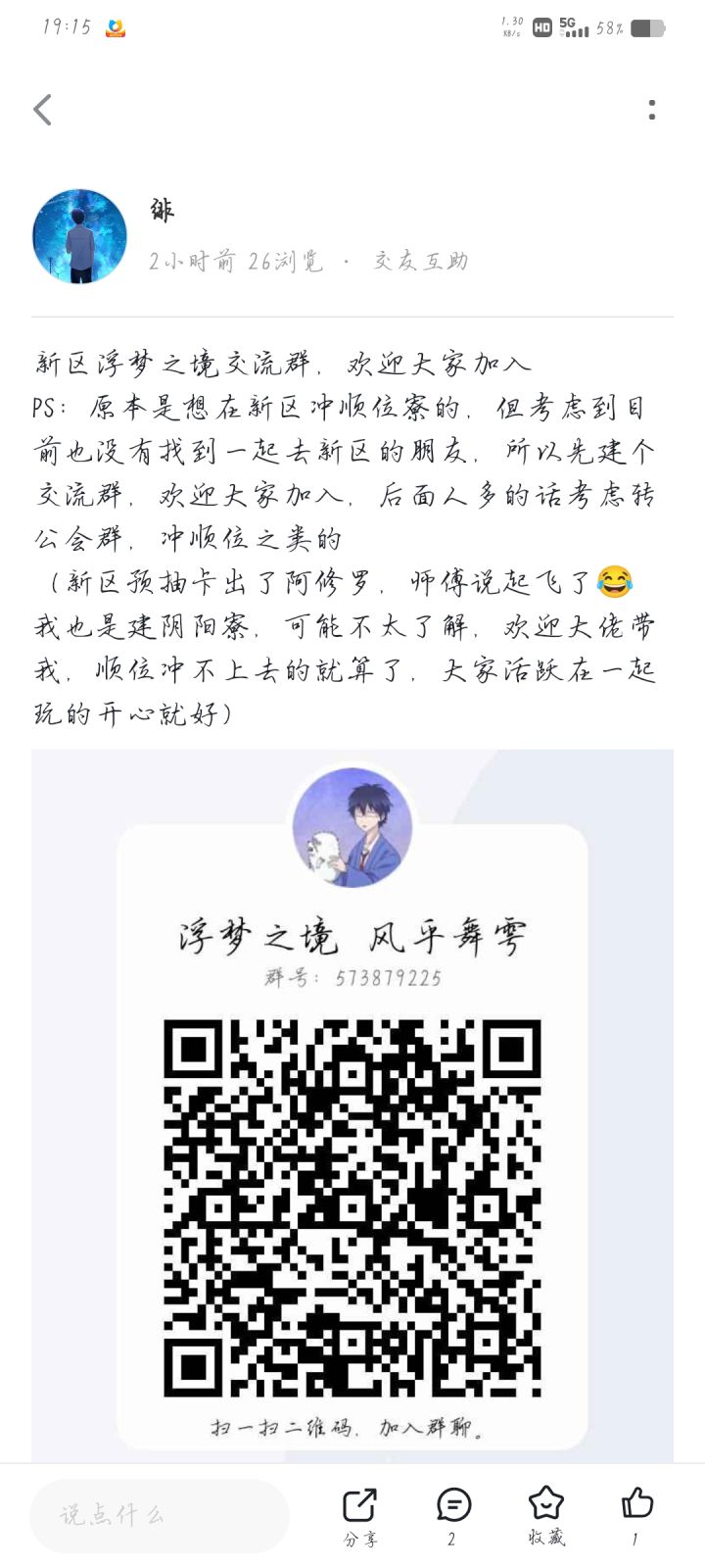 新区浮梦之境交流群,欢迎大家加入PS:原本是想在新区冲顺位寮的,但考虑到目前也没有找到一起去新区的朋友,所以先建个交流群,欢迎大家加入,后面人多的话考虑转公会群,冲顺位之类的(新区预抽卡出了阿修罗,师傅说起飞了😂 我也是建阴阳寮,可能不太了解,欢迎大佬带我,顺位冲不上去的就算了,大家活跃在一起玩的开心就好)