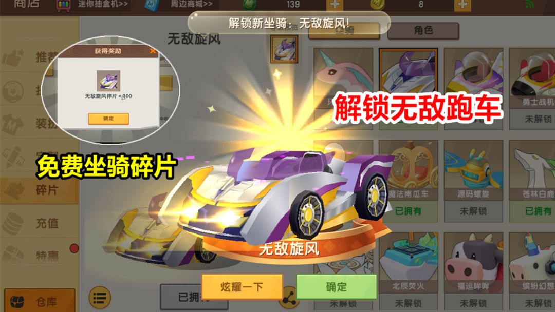 迷你世界:绝版坐骑无敌旋风免费领,一秒集300碎片兑换超级跑车