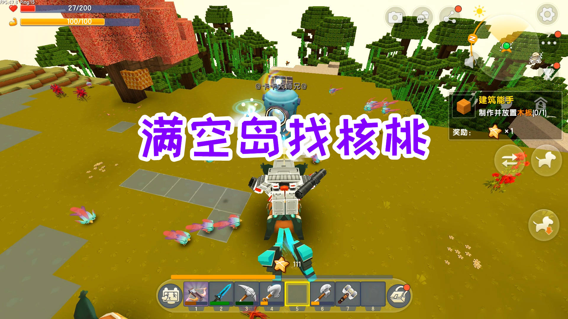 迷你世界双人生存71:满空岛找核桃,驯服了好多雀莺,获得羽毛