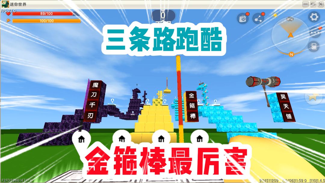 迷你世界:三条路跑酷!金箍棒vs魔刀千刃vs昊天锤!金箍棒最厉害