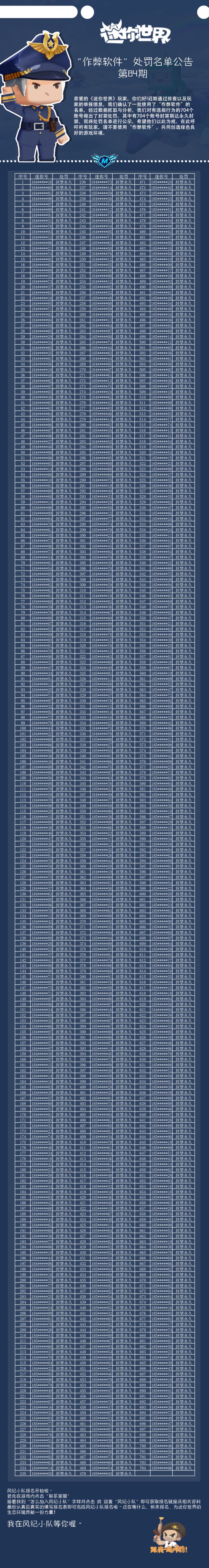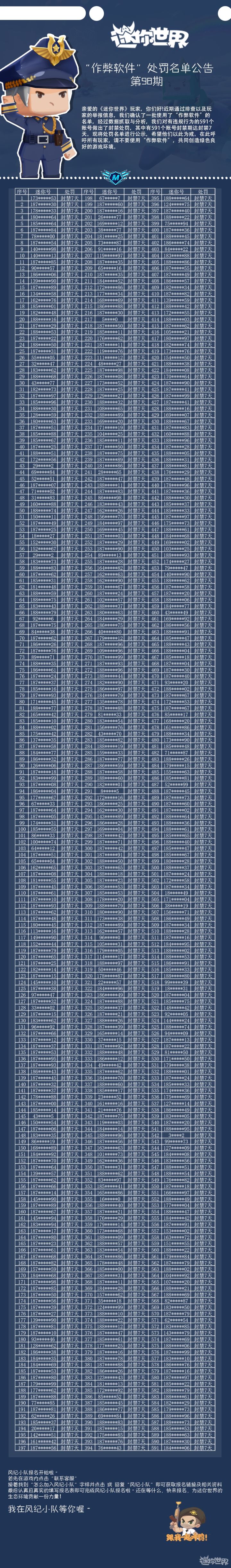 亲爱的《迷你世界》玩家,你们好!近期通过排查以及玩家的举报信息,我们确认了一批使用了“作弊软件”的名单,经过数据抓取与分析,我们决定对他们给予对应的处罚。现将处罚名单进行公示,希望他们以此为戒。在此呼吁所有玩家,请不要使用“作弊软件”,共同创造绿色良好的游戏环境。