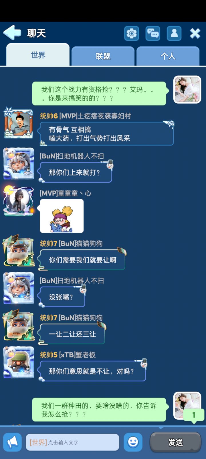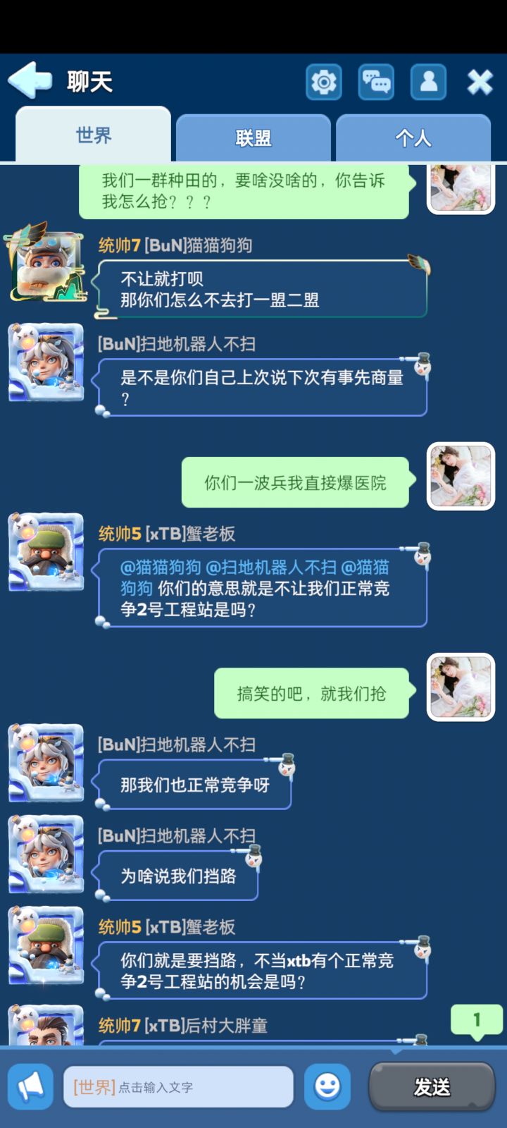 游戏实名,50区不能来的理由!!!#无尽冬日 #无尽冬日玩家退坑指南 以前是睁一只眼闭一只眼,现在忍不了了,如下:1.大佬氪金,跨国打不过,找打的过的打2.50区,就这2个大盟,堡垒全让一盟占有,让你没活路,他的想法是只留一盟(活人多少,我无所谓)3.小盟全部合并,一盟放不下放分盟(小号盟),谁不来谁死4.50区也算老区了吧?之前一直处于和平状态,就因为跨国输了,就拿自己人发泄【移民千万