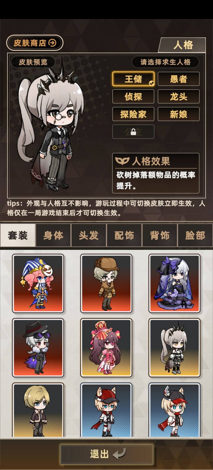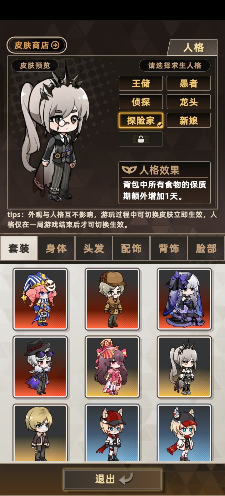 今天v2.0更新,新增皮肤、人格系统。 皮肤需要游戏币抽奖获得,人格解锁对应皮肤获得人格简介:王储:砍树提升掉落物品概率愚者:电力每日消耗-2侦探:提高遇见宠物概率龙头:尸潮基础逃跑+20%探险家:食物保质期+1天(T0级(ÒωÓױ)!!!)新娘:食物每日消耗-2ps:难度没调高、我个人主页有攻略照旧
