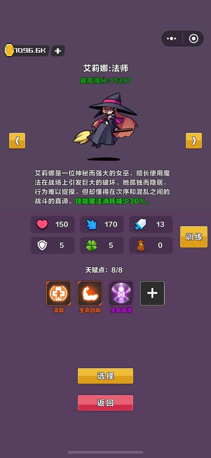 先拿上最超模的角色,看俩广告就送的戏法师。随便刷几次把天赋点解锁了,500金币一点很便宜。顺便解锁一下汲取和生命回响,前期出场带上这俩就够了,多出来2点天赋可以带个回春净化,这些都是能用挺久的。前期优先把汲取提几级,撑一下属性,其他的技能选择上,看你缺啥按照下面的挑着升级。回血最强的是生命回响,怕死就带个回春,回蓝就一个转危为安,缺伤害就靠连击增幅和破甲攻击,10层之前拿上攻守易势和折磨就