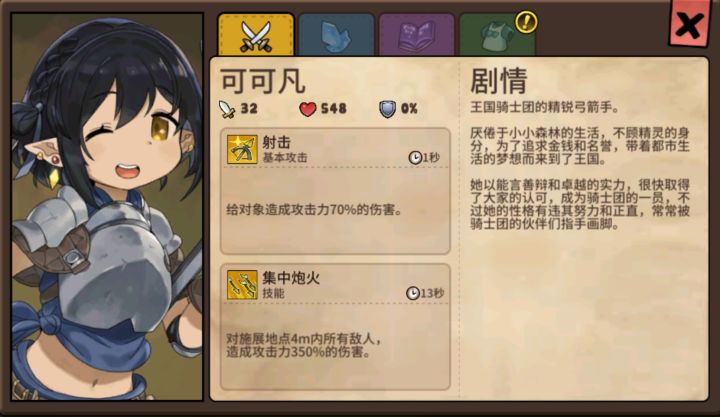 可可凡王国骑士团的精锐弓箭手。厌倦于小小森林的生活,不顾精灵的身份,为了追求金钱和名誉,带着都市生活的梦想而来到了王国。她以能言善辩和卓越的实力,很快取得了大家的认可,成为骑士团的一员,不过她的性格有违其努力和正直,常常被骑士团的伙伴们指手画脚。技能解析:以远程攻击为主,普攻虽然造成70%的伤害,但在水晶强化后,其普攻攻击力提高,配合1秒一下的攻速,让她在输出上丝毫不逊色于其他远程角色。