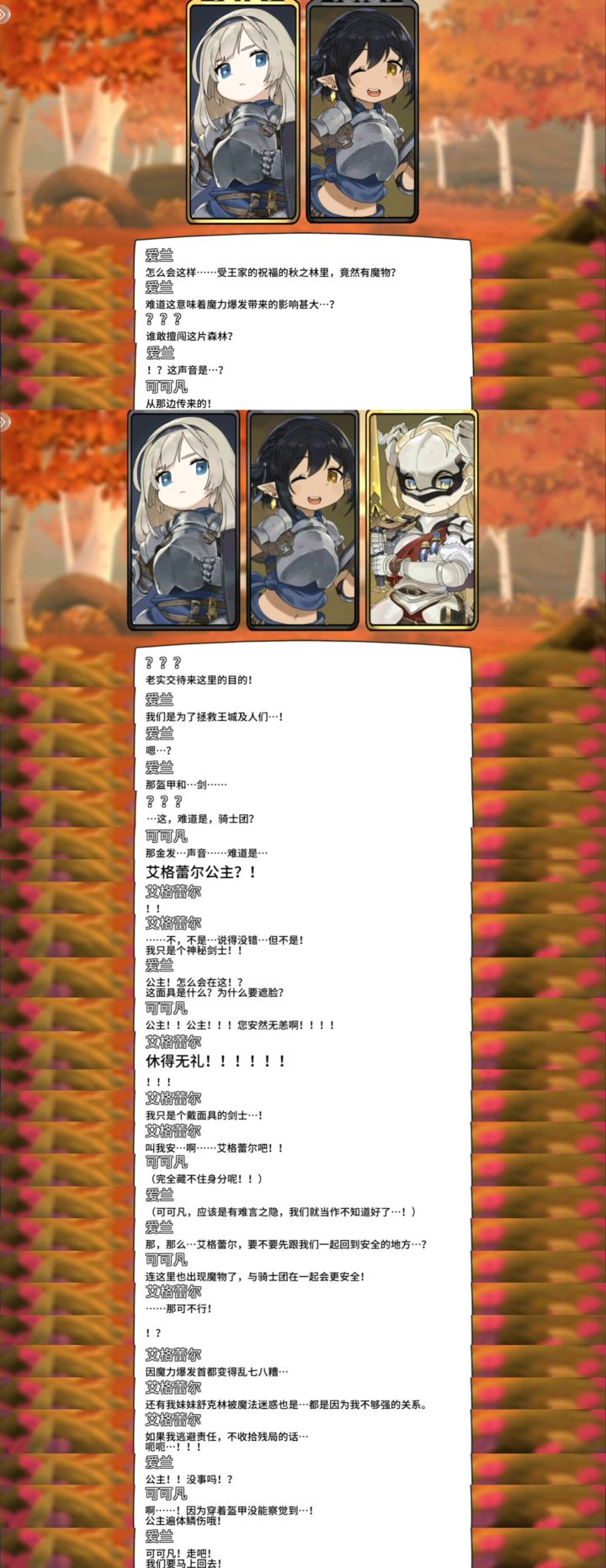 抵达秋之林后竟然遇到一位带着面具的神秘剑士。当她不慎负伤时,被勇敢的骑士团救起时,众人惊讶地发现,这位剑术高超的剑士竟是失踪已久的艾格蕾尔公主。为了保护公主免受敌人的追踪和伤害,她选择了隐藏自己的真实身份,戴上了那副遮掩面容的面具。在骑士团的精心照料下,公主渐渐恢复了些许气力。她向骑士们述说了王城的现状,那里因一场突如其来的魔力爆发而陷入混乱,无数无辜的生命因此遭受牵连。公主的担忧并非空穴来风,