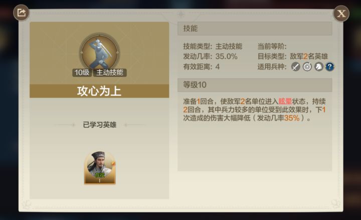 关于《世界启元》中攻心为上和眩晕的机制探讨攻心为上是《世界启元》中一个较为冷门的技能,其冷门的原因是需要撕一张秦始皇才能获得,故这个技能很少有人体验过,这里来探讨一下它的机制,顺便探讨一下眩晕的机制。它的效果具体如下:这里有一个描述非常模糊的效果:下1次造成的伤害大幅降低(发动几率35%)。这或许是这游戏中唯一没有写清具体数值的技能效果,算是提前致敬《黑神话·悟空》。 这个数值具体是