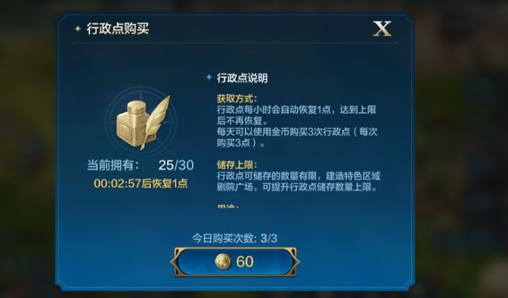 行政点是世界启元当中最重要的货币之一,那么在他的分配方面就相当重要行政点的获取。也可以后续通过商店中的联盟商店和城市集市来购买。也可以用使者来进行城市外交,但是一定要选择贸易城市,会有一定几率获得回复行政点速度的增益。也可以在活动当中的每天定时供奉获得三个行政点。行政点的存取上限。行政点的具体使用方法。军垦 可以通过自己的高级资源地来进行军垦,每次军垦需要花费三个行政点一次最多可以军垦
