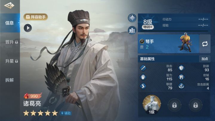 诸葛亮一、自带技能干古人龙类型属于开场发动几率为百分百,可以说非常强力!可以作用于敌军3名单位有效距离为5战斗开始后,每回合开始时,敌军全体智力属性降低(开场)5→10点,(受智力属性影响,该效果可加至战斗结束,无法驱散);奇数回合开始时对随机2名敌军施加失策状态(敌军每次成功发动主动技能时,50%几率打断使其无效)和徒劳状态(敌军每次成功发动追击技能时,30%几率打断使其无效),持
