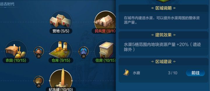 首先主城特色区域的优先级为学院,水渠,剧院广场,商业区为第一档,生产区和军营为第二档,卫城和社区为第三档。下面具体讲一下这些区域的注意事项。1. 学院:解锁城内图书馆和大学,一般来说,分城建立完成后,第一时间应该点满3级图书馆,提高遗迹上限,打满3块遗迹提高自己的科技值,大学的等级一般跟着主城平均点,每个城必备第一选!2. 水渠:在主城(分城)外围两格范围内建造,能够提高5格范围内资源地20%