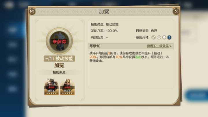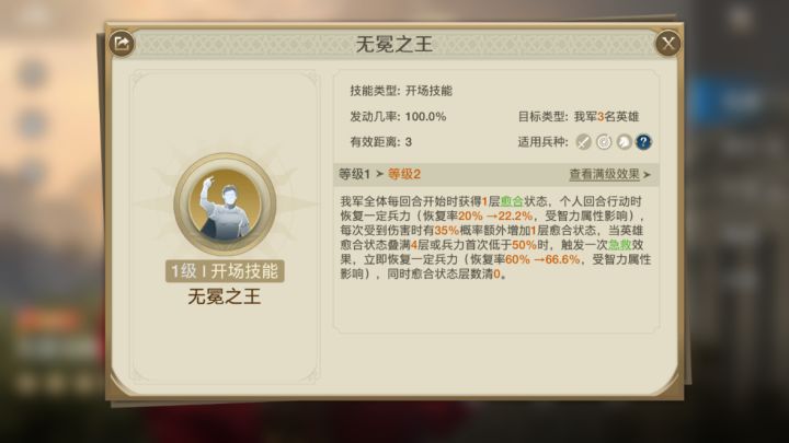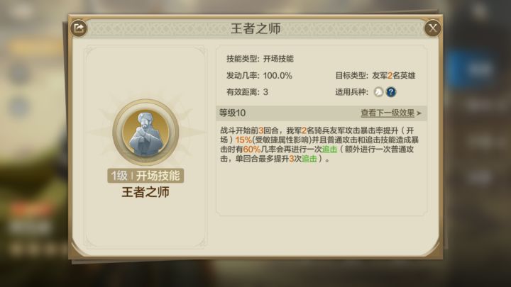 之前版本中一直若隐若现,在高级地守军里打酱油的阿尤布终于出现在卡池的奖励预览中了,看一下他的面板和自带技能:就目前来看,106的敏捷应该是全英雄中最高的一个,然后他的攻击92、防御89、智力84,基本上是六边形战士,人型高达了,这个面板相当恐怖。他的自带技能更是暴力中的暴力,前三回合队伍中两名骑兵友军攻击暴击率提升15%,智力追击系是吃不到这个加成的。暴击后有概率再追击一次,最多来三次。这个