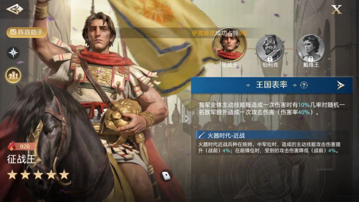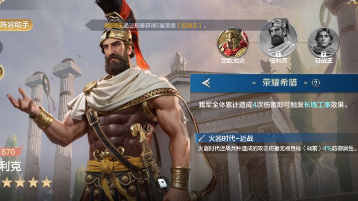 希腊金卡队分别是伯利克里(伯利克),亚历山大(征战王)和大卫王(戴维王),似乎目前玩的人比较少,可能是三张金卡不太好凑齐,所以使得这个阵容使用的人少。这里试着出一个他们三个人的配招,先说结论:亚历山大推荐带箭雨流星+木马奇袭,伯利克里推荐带花郎武道+制敌机先/全境封锁,大卫王带寒光铁衣+枪炮之利。配招思路如下:先看看他们三人的羁绊。三人能组成一个王国表率的羁绊,发动主动技时有概率再造伤一次,