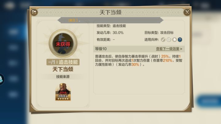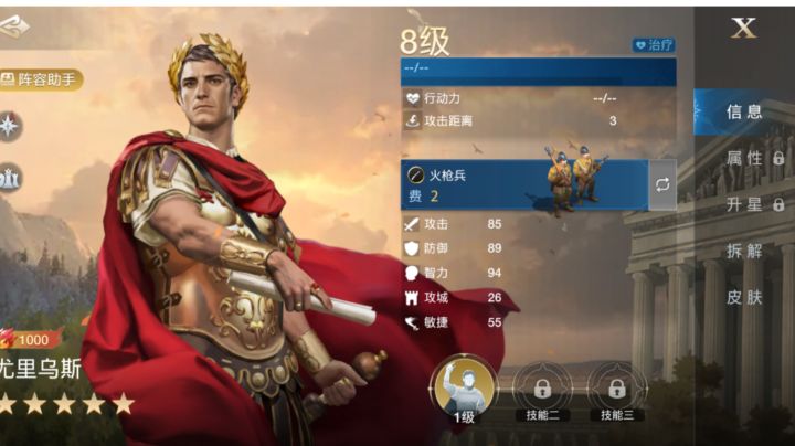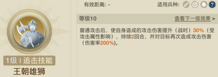 技能选择雄狮王的技能选择,带上【风暴之刃】和【左右开弓】,二者都是非常优秀的追击技能,和雄狮王的自带技能【王朝雄狮】进行配合。【王朝雄狮】能够提升自身攻击伤害;【风暴之刃】能够降低敌方主动技能伤害;【左右开弓】能够增加敌方受到伤害,这三重BUFF加上,没有任何的部队能够抗住几轮。三狮女王的技能选择上,许多攻略推荐的是带上三狮女王自身的拆解技能,能够使自身和统帅获得溅射效果。但是我认为,溅射效果