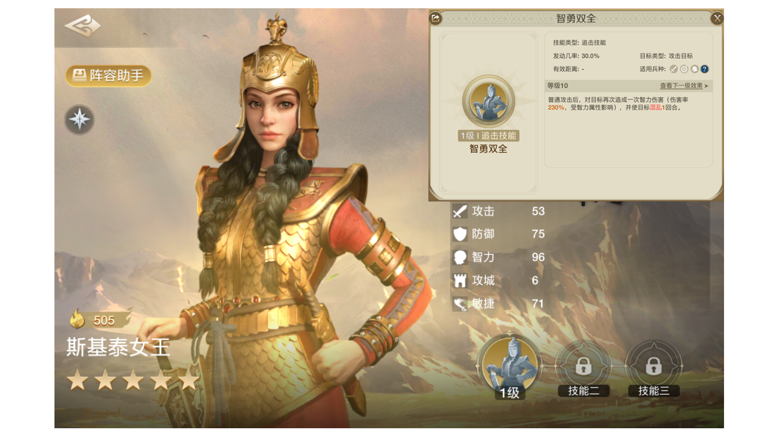 在《世界启元》里,斯基泰女王作为一名五星卡,存在感确实有些太低了,今天就来给大家推荐一套斯基泰女王的阵容,让你看了之后对他有所改观。首先我们来看一下斯基泰女王的弱势在哪里,作为一个追击英雄只有53的攻击,防御和敏捷也只是70+,单看属性实在是平平无奇,唯一亮眼的智力96也没有破百,颜值也不高。粗看一下确实会让人失去培养的欲望。但是看一眼斯基泰女王的技能“智勇双全”,发动几率30%,能够在发动攻