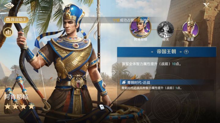 先说结果:阿肯那顿的配招推荐以下几个:弯刀突击+撞阵冲军、扰乱军心/擒王+百计千谋。屯兵/抚民养兵/整顿+合军聚众。先登破敌+攻守兼备/防御反击。埃及紫卡的御三家分别是阿肯那顿、娜芙、哈肯,三人的羁绊是帝国王朝,战前全体加10点的智力。是一个智力法系队。阿肯那顿的一技能是无双妙计,满级效果是:“普通攻击后再次对敌军2名英雄造成一次智力伤害(伤害率70%,受智力属性影响)。”娜芙的一技