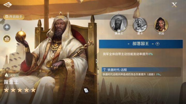 先说结论:黄金王的配招推荐必攻不守+战无不克。直接拿输出就完了。夏卡拿攻心为上+制敌机先。辛加拿寒光铁衣+动摇军心/全境封锁。黄金王、夏卡、辛加,这三位有一个羁绊部落国王,全体主动技能发动概率增加8%。你说它强吧,这羁绊就那样,没有combo;你说它弱吧,8%的概率又还不错。要知道没进阶之前,满级的主动技能的发动概率平均值都在30%-40%左右,进阶满了之后,发动概率在40%-50%左右。这