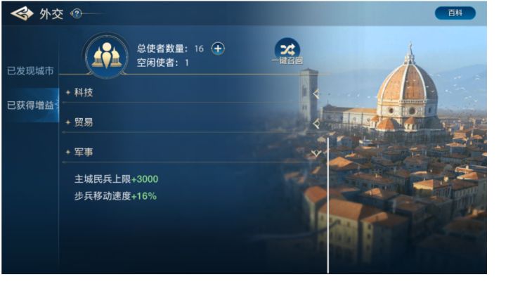 大家好!我们今天来和大家唠唠《世界启元》中这个城市外交的功能!合理的与城市外交就可以让你发展更迅速哦!外交介绍我们先简单说一下城市外交的基础。第一是需要首次获得城市视野后才可与其外交,不过盟友间可以共享已发现的城市,所以加入联盟还是很重要的。与城市外交要派遣使者(这个使者的数量可以通过完成主线任务获取)派遣使者数量不同,获取增益也不同。当你的联盟占领城市后,就会获得城市的所有增益,就无需
