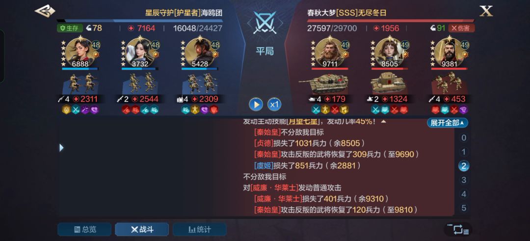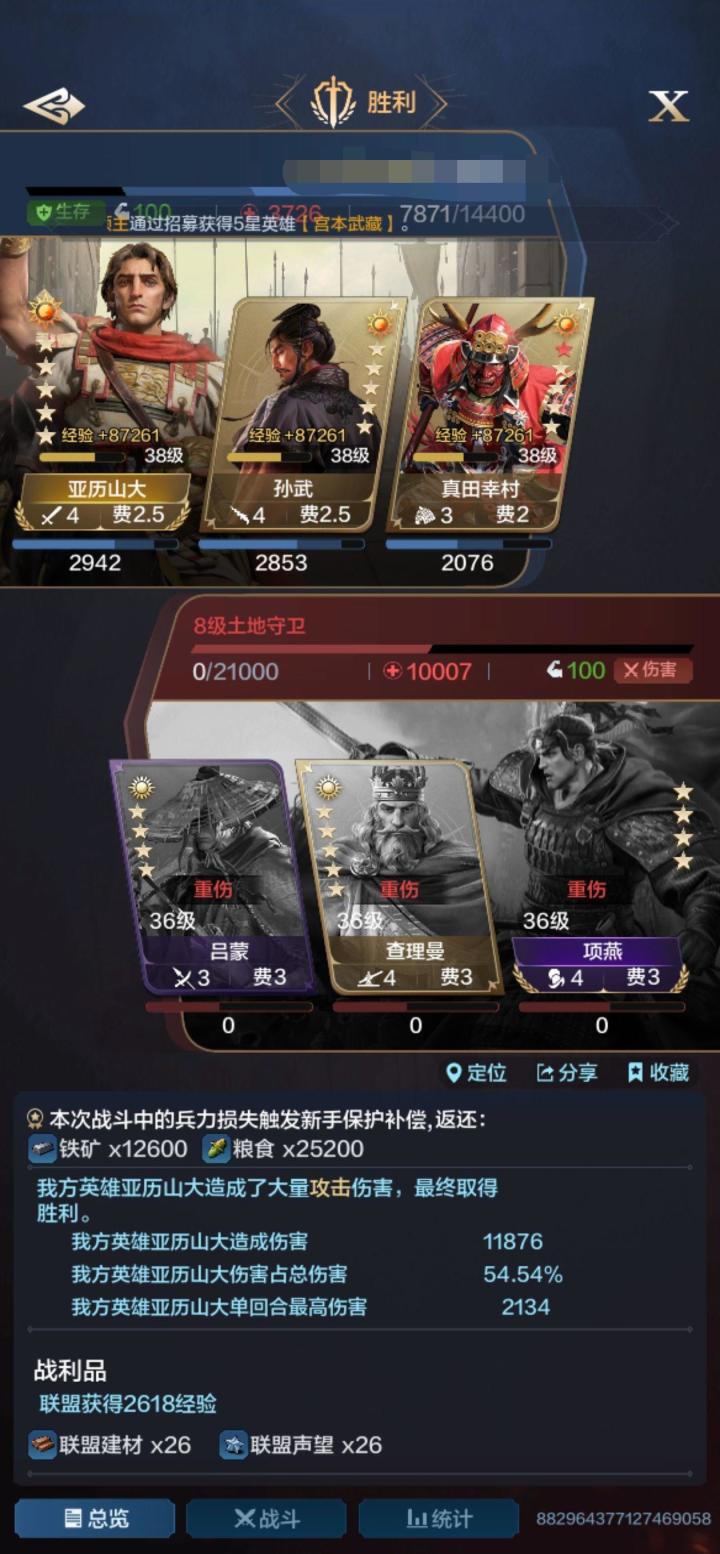 第一期博览会如期而至,主题武将孙武,亚历山大,表现强势,一个主输出,百分百释放的多段伤害技能再也不用担心概率问题.一个主辅助兼顾输出能回复兵力还能给予敌军伤害还能降低我军受到伤害可以说是万精油武将.强力推荐入手.这是来自亚历山大孙武真田辛村的开荒8级地的战报总览分析:从战报看我方在兵力劣势的情况下取得了胜利,亚历山大攻击输出爆炸。技能分析:我方全体都带的主动技能最大限度触发真田辛村技