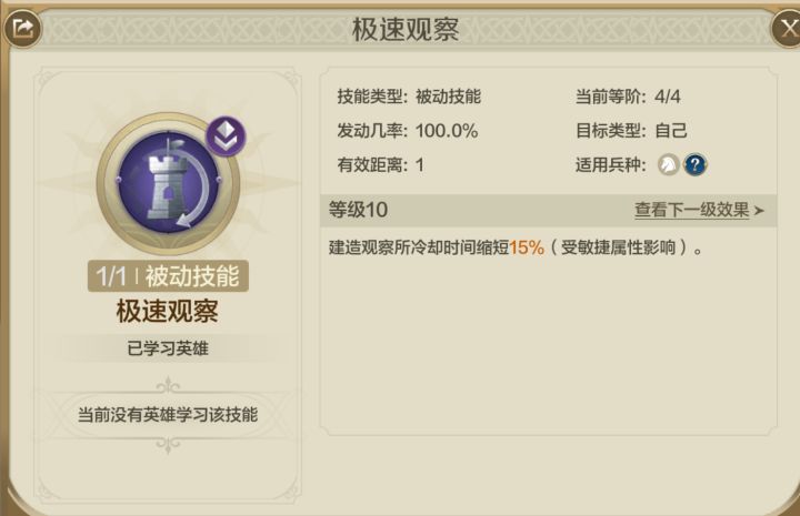 上一期为大家推荐了《世界启元》中一些好用的紫卡英雄,这次再来看看有哪些好用的紫卡技能,但是技能不像武将,拿到重复的就可以升星,紫卡的进阶同样需要技能手稿,并且最高只能升到4阶,而金卡能升到5阶。虽然需要的数量会比橙卡少一些,升到4阶需要20+30+50=100技能手稿,但是升阶过后时不能返还的,升阶前还需要谨慎考虑。在上期就提到过俩个战略英雄的拆解技能【急速观察】(减少建造观察所冷却时间)与【快