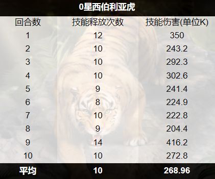 领主大人好~白孟加拉虎、华南虎、西伯利亚虎三虎相遇,谁更强?今天一起看看三只猛虎的横向测评表现!打野测试伤害比较◎ 测试对象35级野生兽群◎ 测试阵容华南虎+科迪亚克棕熊+大独角犀西伯利亚虎+科迪亚克棕熊+大独角犀白孟加拉虎+科迪亚克棕熊+大独角犀◎ 测试表现:华南虎VS西伯利亚虎1.稳定性:华南虎技能释放极为稳定,场均在11-12个技能;2.均值伤害:华南虎技能均值伤害比