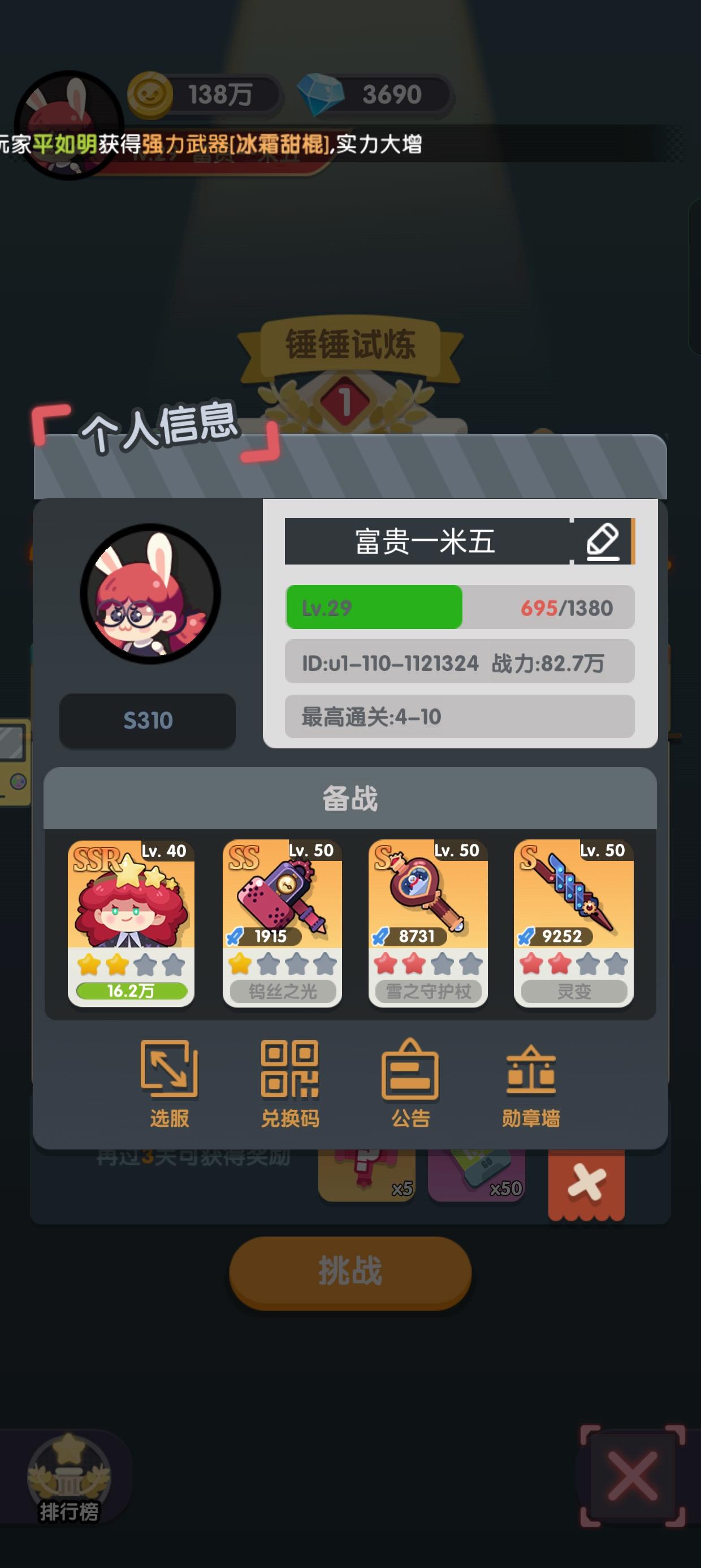 游戏ID:u1-110109188关卡主线直线抵达153,是的,我很佛系。