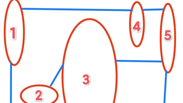 方法介绍:观察下图谜题可将岛屿分成以下 1~6 岛屿群,以及 7~8 连接岛屿将岛屿群(红圈)视为一个整体,并画出岛屿群之间可能的连接关系(蓝线)得出下面无向图可以看出岛屿群 3 和岛屿群 5 的连接为该图的割边,所以该边一定存在因为岛屿群 3 和岛屿群 5 之间只存在一种连接可能(下图红线),所以该连接一定存在剩下的就很简单了。不过这里还能继续对岛屿群进行分析:观察岛屿群 4 ,
