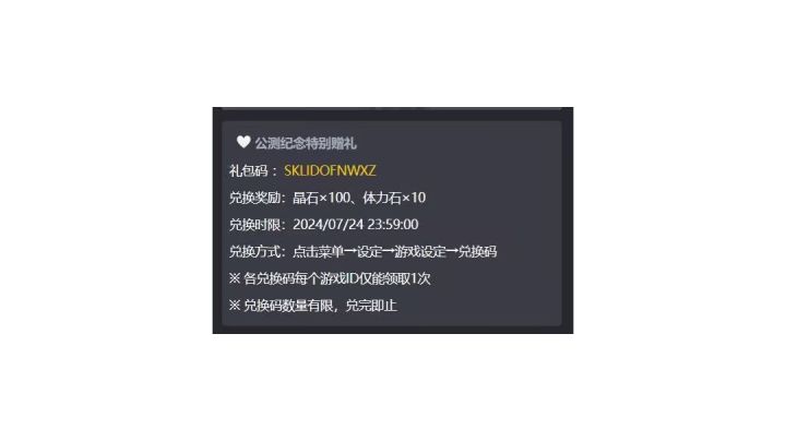 兑换码①HBR717RELEASE-7月24号截止②ND6AUKW927-7月24号截止③WDV3TP8BAC-7月24号截止④RCBY5PV4SM-7月24号截止⑤SKLIDOFNWXZ-7月24号截止⑥YNSMOAPFBN-7月24号截止⑦HBRFREESSYURI-7月25号截止⑧HBR2024AB-7月26号截止还请尽快使用~📚使用方法:菜单>设定>游戏设定>兑换码※ 各