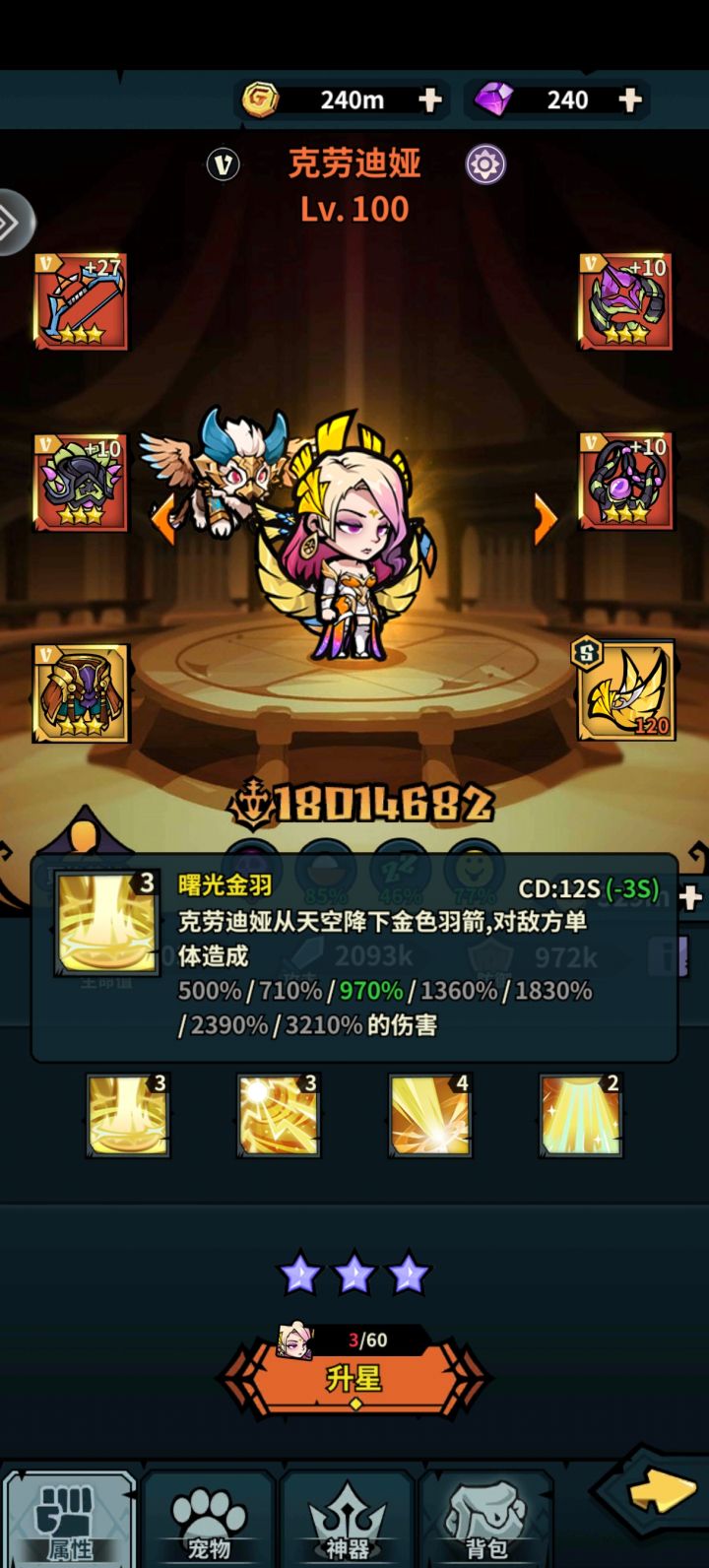 总结一下: 克劳迪亚,简称光弓,4技能满级之后,堆攻速,配合光战的减疗,几秒融化对面光战,特别是攻速拉满一秒打5下,一秒就最少扣5%的血,还不算本身的攻击,最强C实至名归,推荐词条PVP首选攻速,次选攻击,再次选终极伤害,暴击,暴击伤害,有条件一定要入手,资源全给,神器直接拉满,宠物拉满,无敌的存在