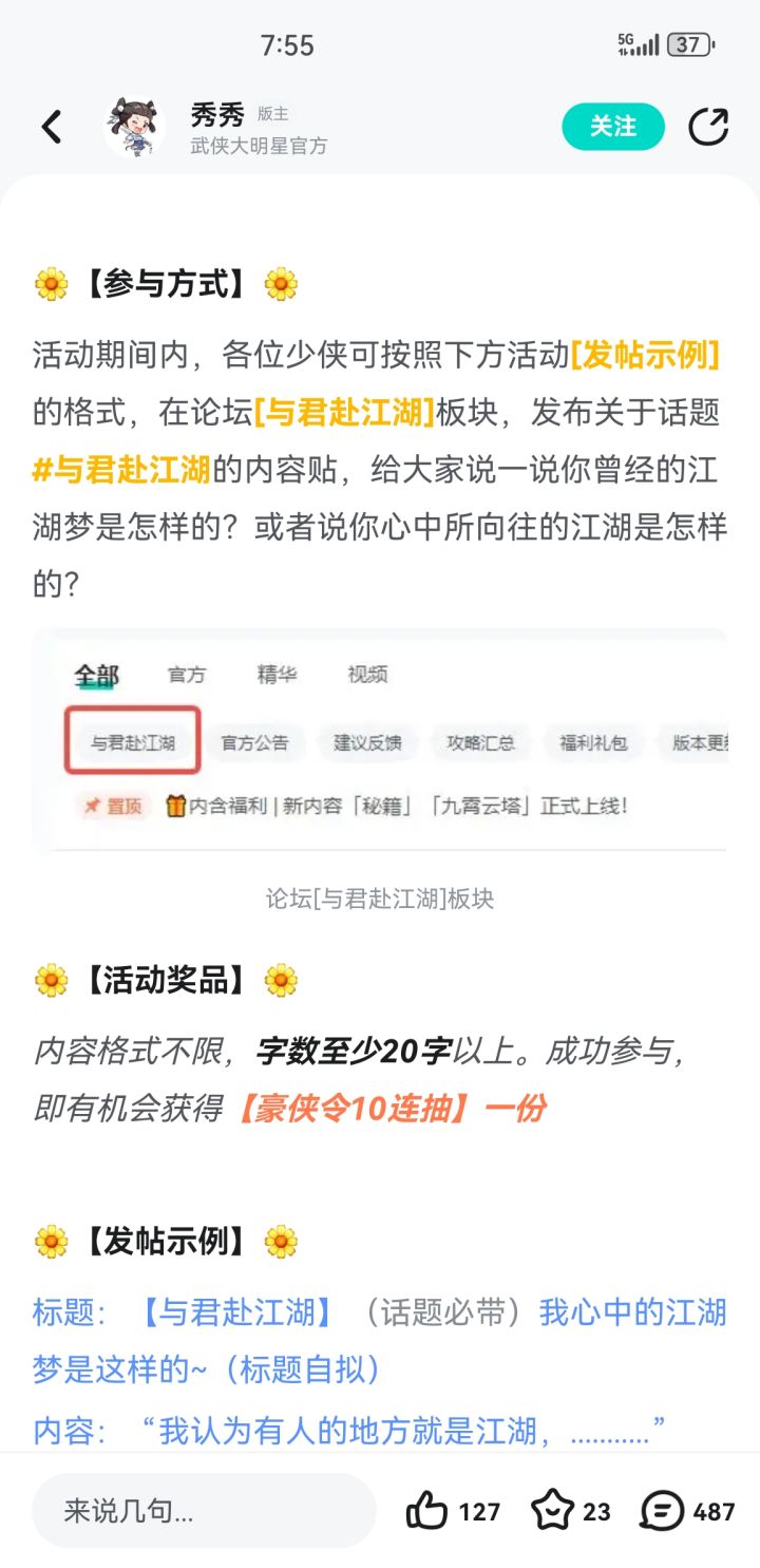 活动期间内,各位少侠可按照下方活动[发帖示例]的格式,在论坛[与君赴江湖]板块,发布关于话题#与君赴江湖的内容贴,给大家说一说你曾经的江湖梦是怎样的?或者说你心中所向往的江湖是怎样的?#与君赴江湖
