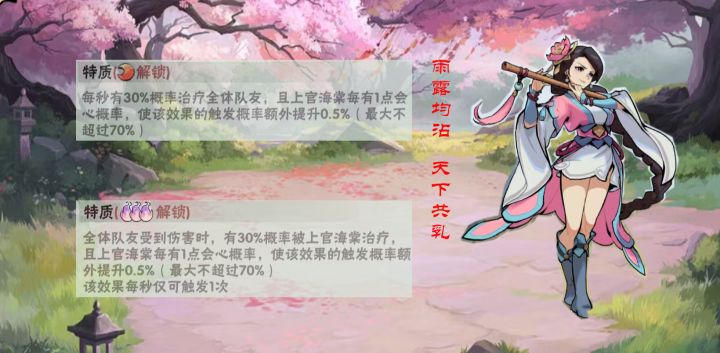 白板上官海棠实用性远超秦真,0氪微氪必拿一张。氪佬必须经脉氪满,全体60%减伤太逆天了,你和一个满脉的海棠PK能让你绝望,过这个村就没这个店了,机会只有一次。这里只讨论白板上官海棠的价值,平民玩家的福利。与曾经的奶量第一人秦真相比,在输出方面上官海棠同样是穿透攻击,还有特殊攻击,在攻击方面稍胜秦真一筹。在治疗方面上官海棠的群奶远超秦真,上官海棠每秒30%的概率奶全队,配合双会心,概率40%加,