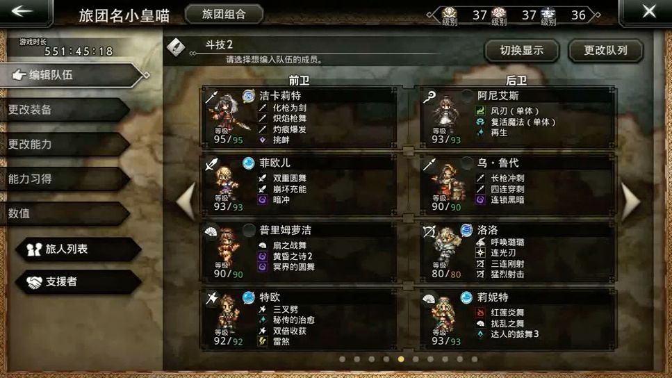 无支援。 主力角色:ex洁卡莉特,普里姆萝洁,乌鲁代,特欧。 自己还带了亚芬(提供破防回合队友满豆boost),莉妮特(没有10必导致离6T差点意思),温格特(暗2连全体+20增伤),劳拉(纯挂件,开局降属防#)