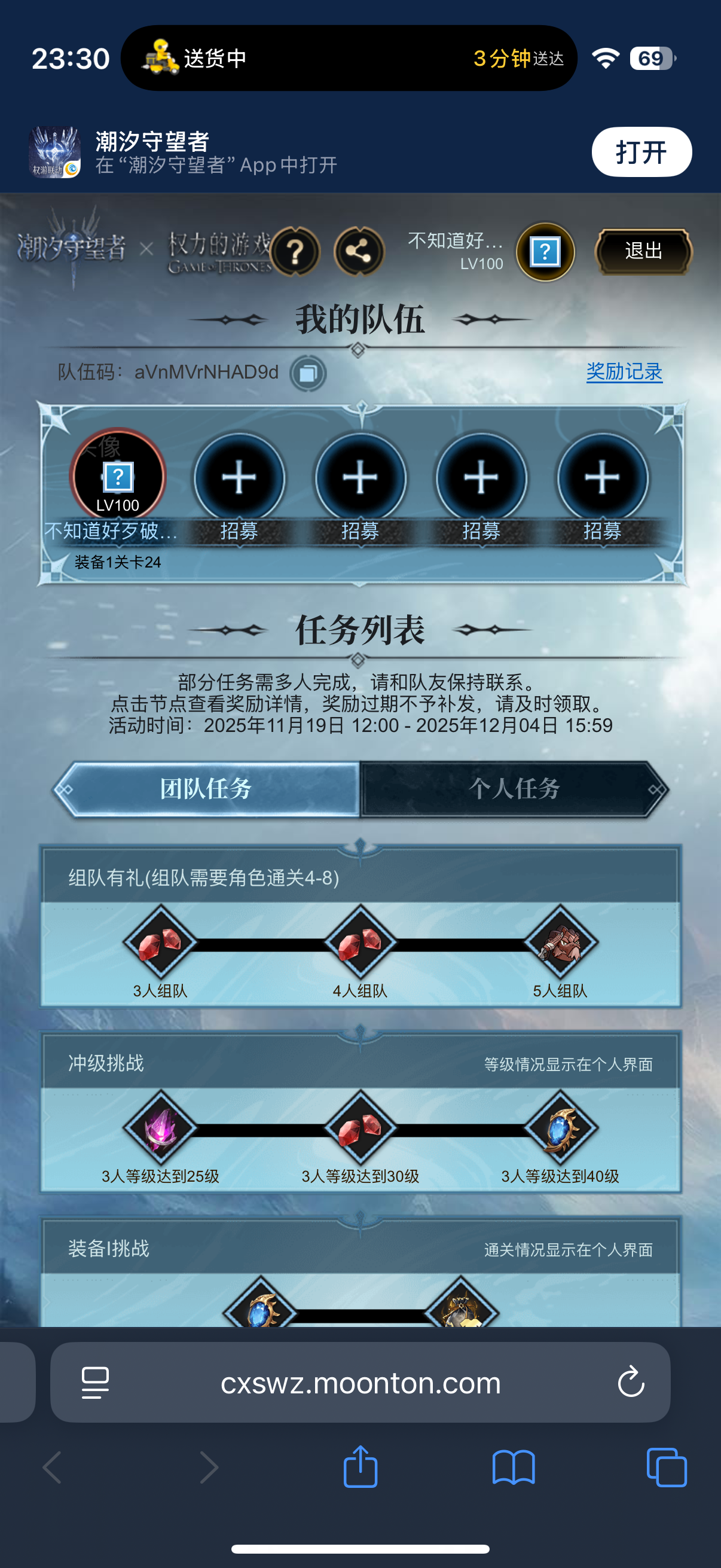 我的队伍码:wNhby9y1uOlV,《潮汐守望者》x 《权力的游戏》特别活动服【凛冬幻象】组队活动开启!欢迎加入我的队伍一起领限定皮肤、表情和召唤水晶等奖励!活动地址:https://cxswz.moonton.com/event/xfzd/