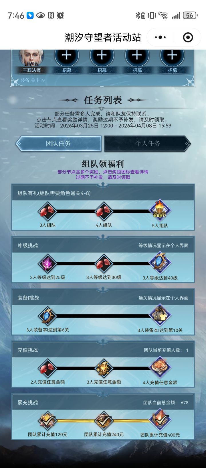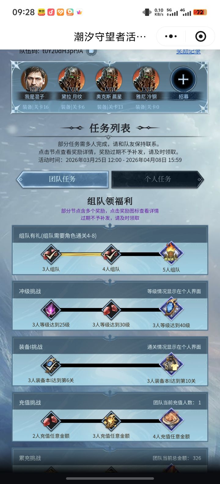 组队来,已经氪了,潮汐守望者新服组队网页活动上线,欢迎加入我的队伍一起领奖励,队伍码:9488893