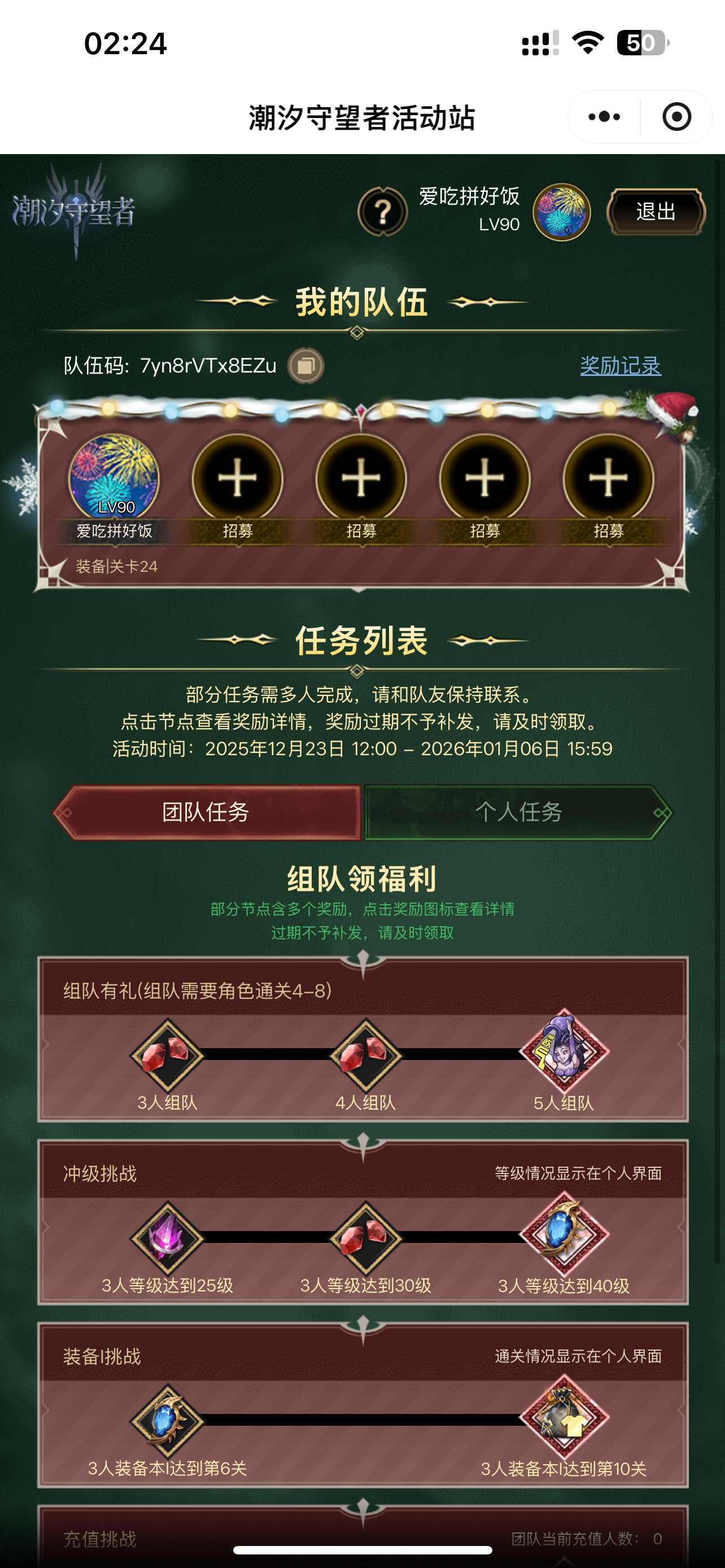 我的队伍码:【7yn8rVTx8EZu】,微信小程序搜索“潮汐守望者活动站”,加入我的队伍一起领限定皮肤、表情和召唤水晶等奖励!