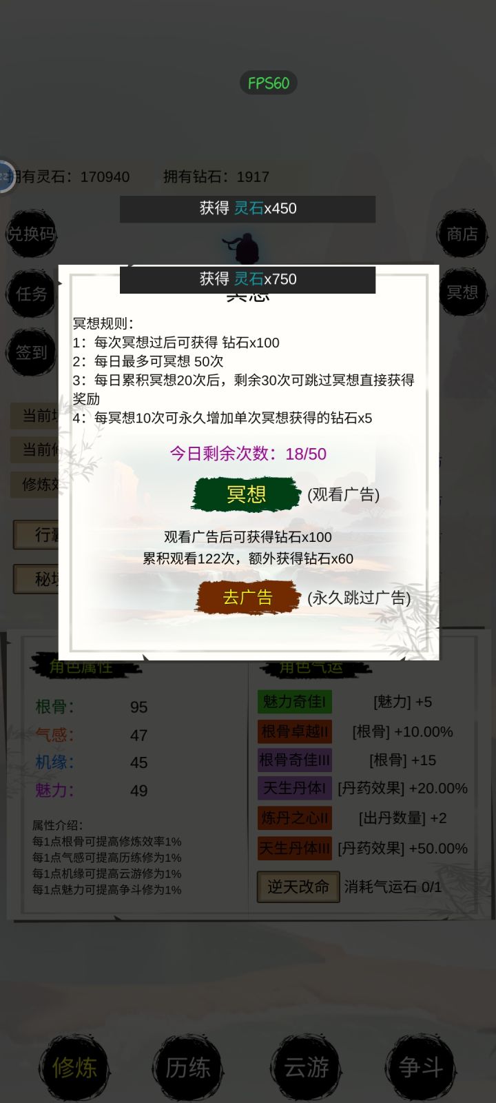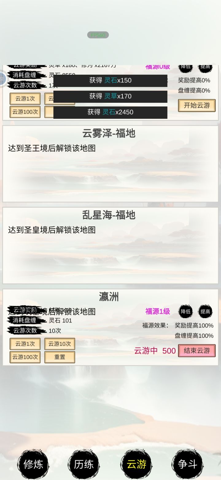 建议角色气运可以逐条刷新,可以逐个锁定,刷新其余的,建议境界修炼继续增加数据,现在我都玄仙了,境界根本不敢点,因为性价比太低,建议商店多一些物品,增加一些特效,新手友好度拉满,像什么升仙丹,一颗成仙,天赋丹,增加天赋,修炼丹,云游药草加倍丹,……诸如之类的,
