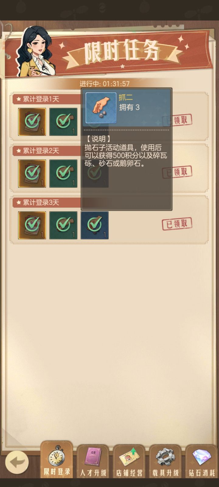 最后一天了才发现,这一期的小游戏明明是拍洋画,结果每日签到给的道具是抓石子的