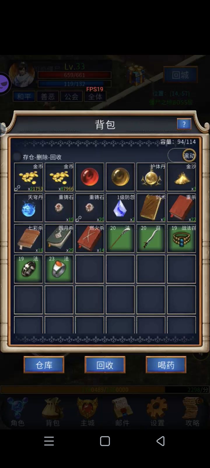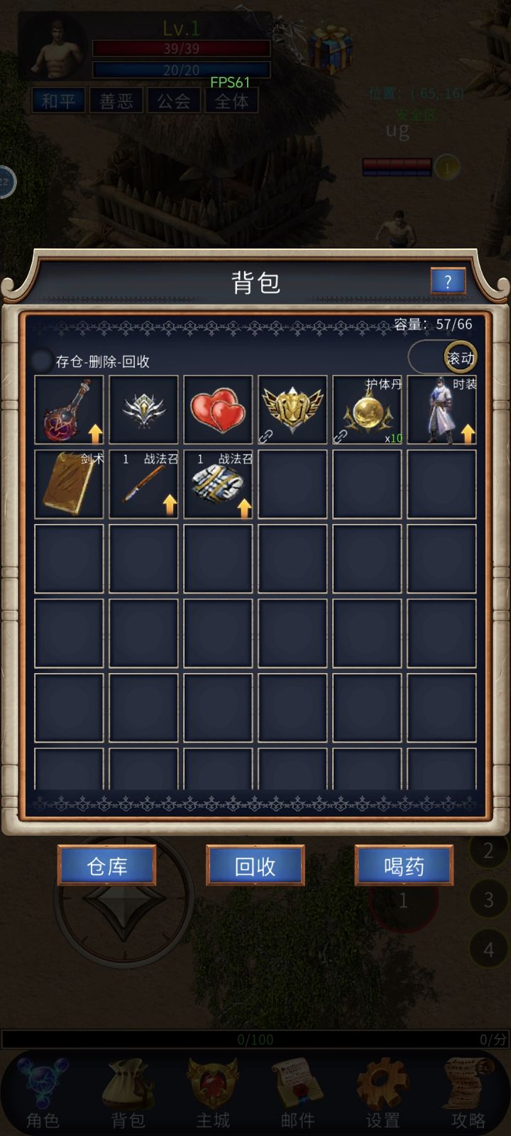 话不多说,进入游戏。选择自己喜欢的职业。共3职业 战士 前期进度慢 后期伤害爆表打架职业、法师刷怪刷钱职业 但是就是费蓝、道士简单就是一个辅助职业 毒防止boss回血。选好职业进入页面 打开背包 拿把包里能用的都用了,弄好直接选择传送地图 第一个图 挂机,弄好这些开始按照步骤走1.页面点击主城 ,签到拿钱(签到7天可以循环)、页面左上角点赞30万金币拿起、页面设置里有一个广告也可以拿金币(如果不想