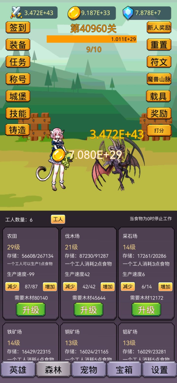 开局应该怎么玩:开局先不着急签到,啥都不动,就用cloth666兑换码,弄个1阶稀有装备,然后推关到21关,重置1关,重置两次,然后用兑换码chongzhiguan,就能获得两次重置次数,再去重置两次,获得400符文,把符文点满,再看广告,记得先升级符文,再看广告,重要的事情说三遍,先升级符文再看广告,保证拿到最多的钻石森林怎么玩:农田可以生产粮食,但是要买工人,然后伐木场是消耗粮食的,你需要保