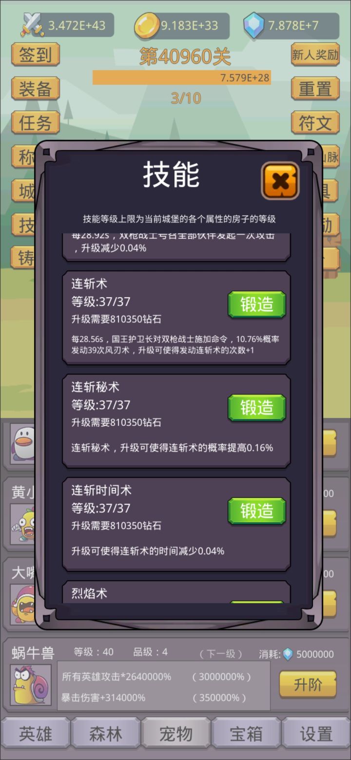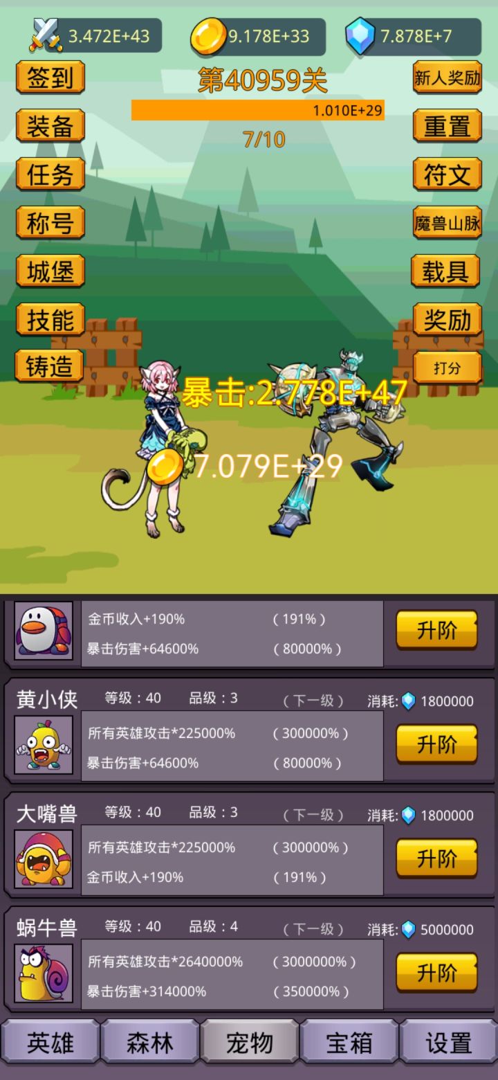 开局先别签到用兑换码cloth666,1阶稀有装备,刷出属性在7000%~8000%攻击,没有就卸载重开,其他兑换码chenghao666,chenghao888,chenghao888888得称号值,推到25关重置两次,每次重置1关,然后用兑换码chongzhiguan,再去重置两次,获得400符文,升级符文,再看广告,看完20个高级宝箱,再去签到,每天任务奖励别忘了。森林玩法:买工人,优先升