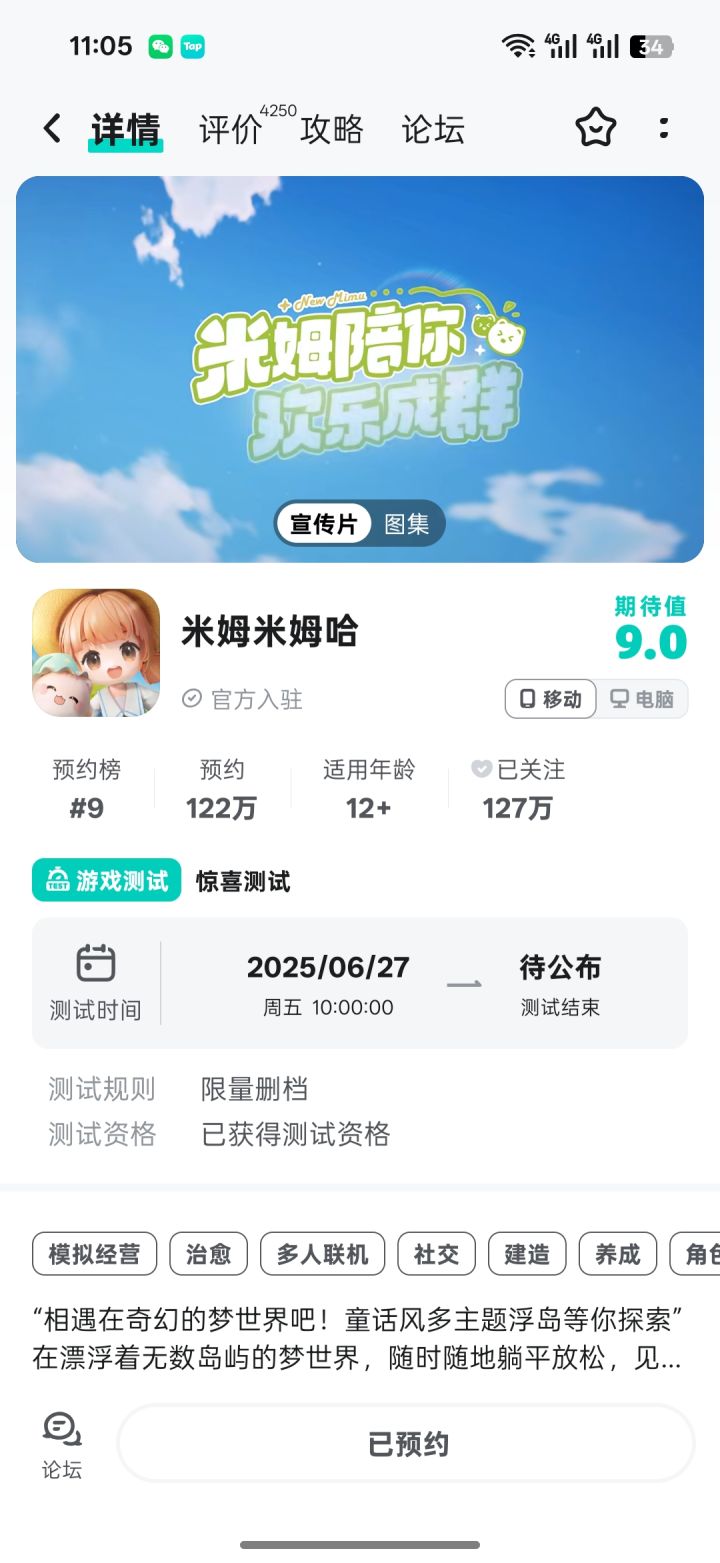 mimu~mimu!「相伴测试」招募启动!人,你可以在米姆的陪伴下开启...米姆环绕、种田打工轻轻松松;自由岛建、一键蓝图爆改不愁;长线社交、随时随地集结姆友;多端互通、0孤单全糖陪伴的浮空岛生活~==测试基本信息==测试类型:限号·计费·删档测试平台:安卓、PC招募时间:4月11日10:00~4月23日23:59推荐配置:安卓端 操作系统:Android9及以上 运行内存: