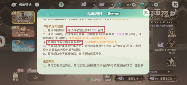 今天的男女套各6个部件,开服玩的常驻基本都抽到了吧,那第1和3点就是差不多十抽必出一个男套或女套其中一个未获得部件,运气再差,只要常驻抽完了那120抽男女套都齐了