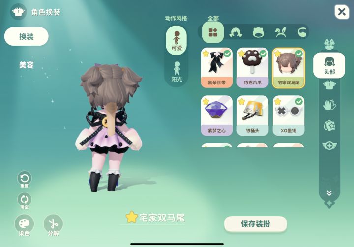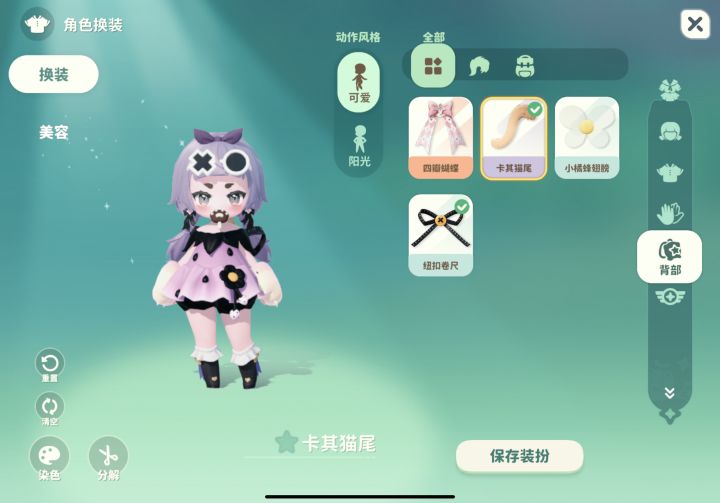 不知道有没有人和我一样对出的套装并没有什么兴趣,只是喜欢一些小配件的哇。(真的很溺爱这个初始选项里的发型,不能染色有点可惜)个人不太喜欢草莓裙的初始配色,但是染色了以后真的超!级!好!搭!最喜欢的是这套紫色的搭,黑色小蝴蝶结和这件衣服也很适配,把蝴蝶结调小了当小翅膀装饰就不会和猫尾巴打架了。这套的黑皮有点涩谷辣妹的感觉也很萌。小树苗调大了贴头发比初始可爱超级多,竹蜻蜓也可以转到前面当作小雏