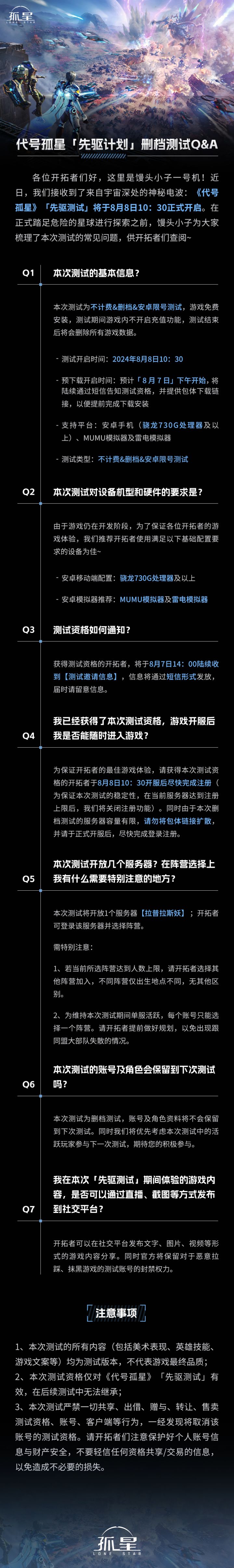 各位开拓者们好:《代号孤星》 「先驱测试」 将于8月8日10:30正式开启。在正式踏足危险的星球进行探索之前,馒头小子一号机为大家梳理了本次测试的常见问题,供开拓者们查阅~详情点击上图↑↑↑↑↑↑