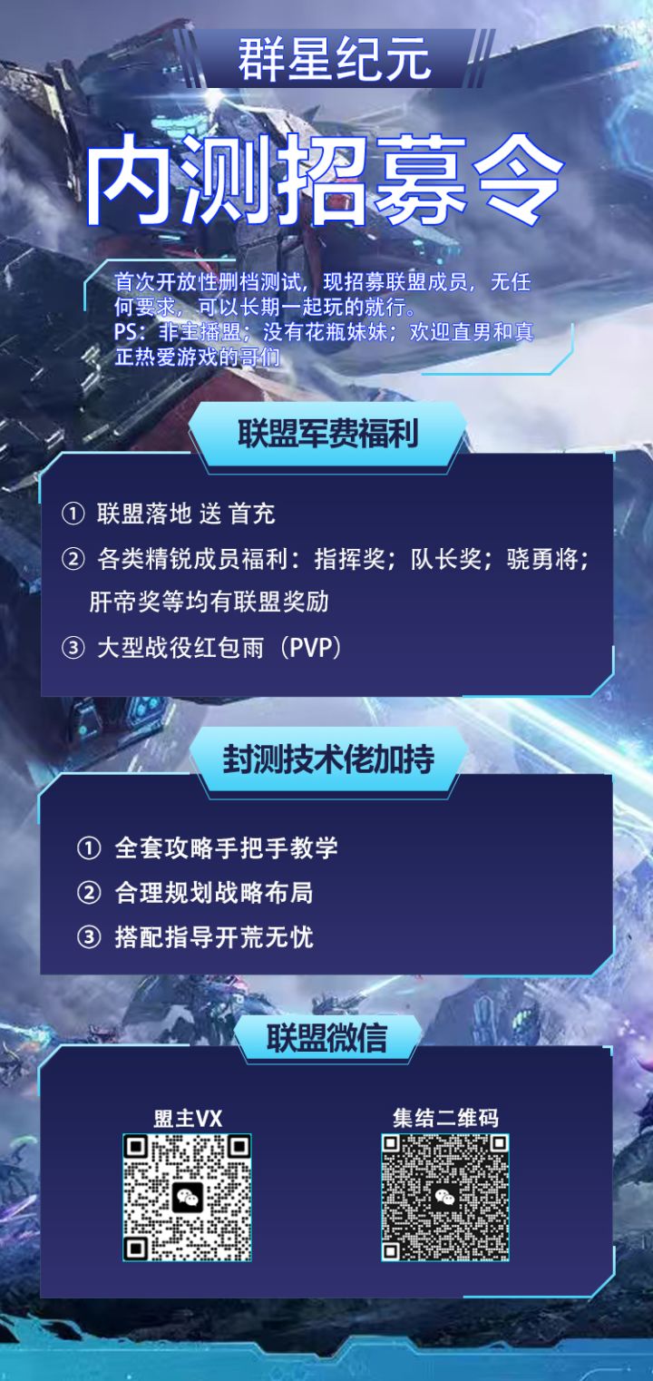 腾讯首款 SLG+RTS 类手游 《群星纪元-代号:孤星》10月31号首次开放性删档内测 联盟落地福利,军费激励奖金封测技佬带队,成熟布局安排丰富游戏体验,多次带队经验联盟历程:荣耀新三国;战地无疆;重返帝国;战火勋章;乱世王者;鸿图之下;红警OL;卧龙吟;万国觉醒;王国纪元;率土之滨;世界启元;魔法门等SLG类游戏欢迎喜欢SLG对抗以及RTS的铁铁们,本次联盟备战600人